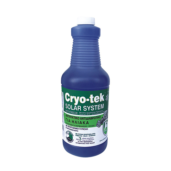 To CryoTek Solar 1L Αντιψυκτικό για ηλιακά συστήματα είναι το μοναδικό αντιψυκτικό της αγοράς με 100% παρθένα μη ανακυκλωμένη προπυλενική γλυκόλη που δεν προκαλεί διάβρωση με την πάροδο του χρόνου και ειδικούς πρόσθετους παράγοντες για τριπλή προστασία – από διάβρωση, άλατα και κατάλοιπα των ηλιακών συστημάτων.
