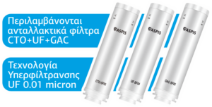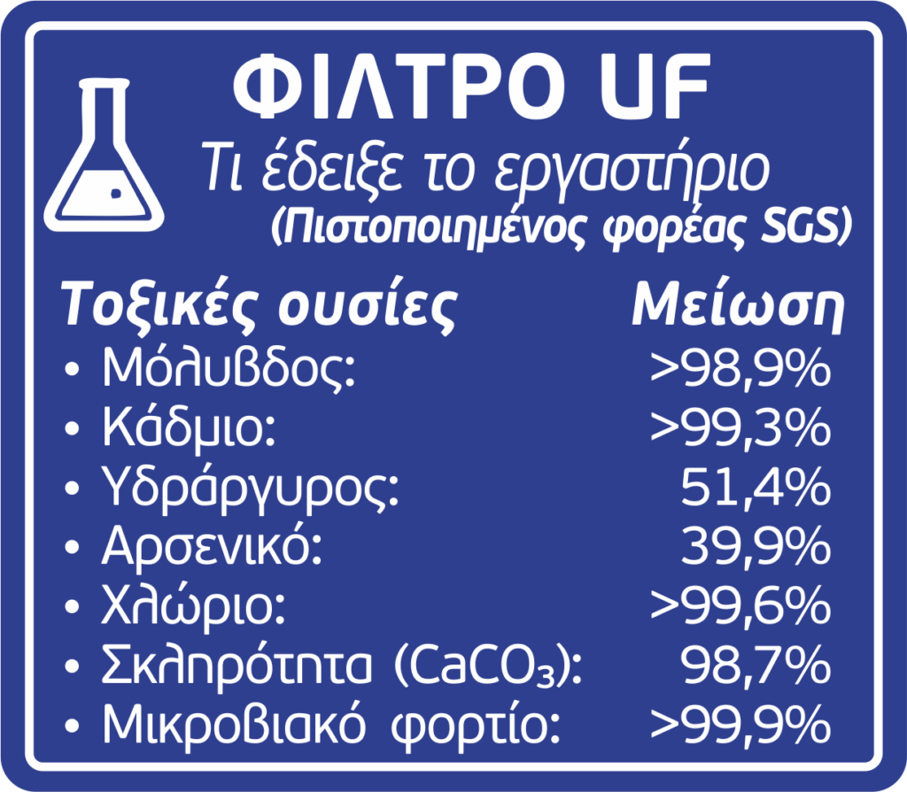 - Τεχνολογία υπερφίλτρανσης UF 0.01 micron, φίλτρο κοκκώδους ενεργού άνθρακα και φίλτρο ενεργού άνθρακα νέας τεχνολογίας
