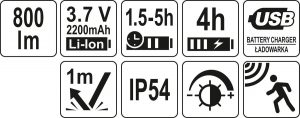 Πολύ δυνατός και λειτουργικός προβολέας Yato με συνεχώς ρυθμιζόμενο φως έως 800lm . Τέσσερις τρόποι λειτουργίας σάς επιτρέπουν να προσαρμόσετε τον φωτισμό στις δραστηριότητες και το επίπεδο φόρτισης της μπαταρίας. Ο ενσωματωμένος αισθητήρας κίνησης σάς επιτρέπει να ανάβετε και να σβήνετε τη λάμπα με ένα κούνημα του χεριού σας. Επιπλέον, ο προβολέας έχει μια σειρά από ανέσεις – ρυθμιζόμενη γωνία φωτισμού, αποσπώμενο από τη ζώνη , μαγνητική βάση και ένδειξη φόρτισης μπαταρίας. Ο προβολέας τροφοδοτείται από μια μπαταρία ιόντων λιθίου υψηλής χωρητικότητας που παρέχει 1,5 έως 5 ώρες λειτουργίας.