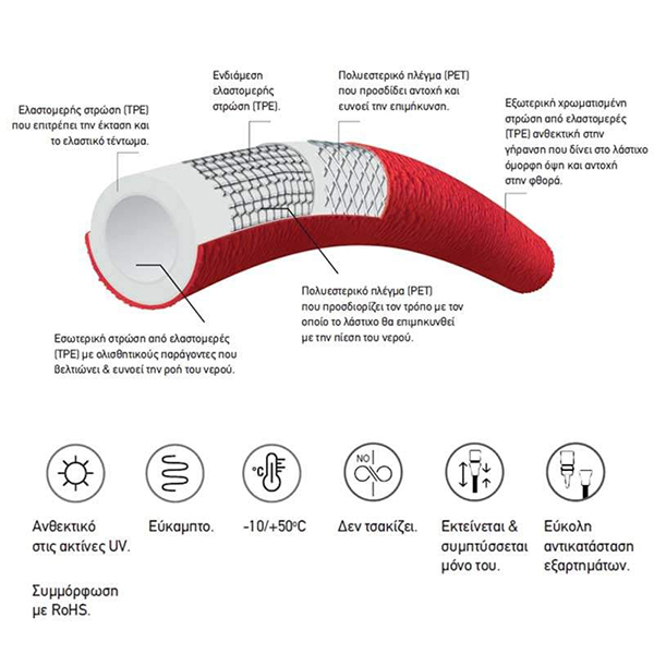 - Λάστιχο ποτίσματος με πιστόλι ψεκασμού πολλαπλών χρήσεων με 4 διαφορετικούς τρόπους ψεκασμού.