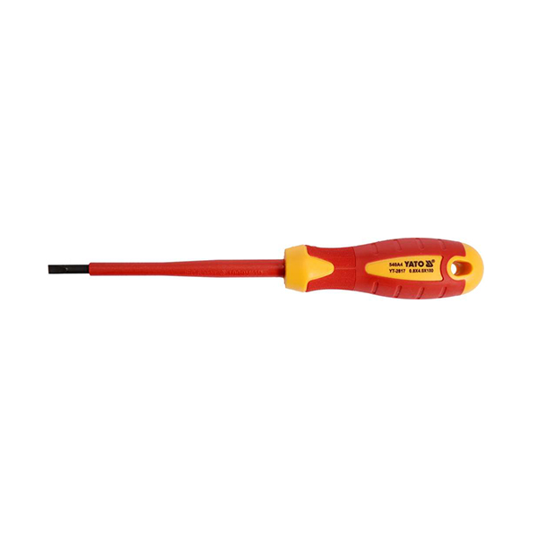 Επίπεδο κατσαβίδι YT-2817 με μόνωση VDE, κατασκευασμένο από ανθεκτικό χάλυβα S2 με σκληρότητα HRC 56-60 .