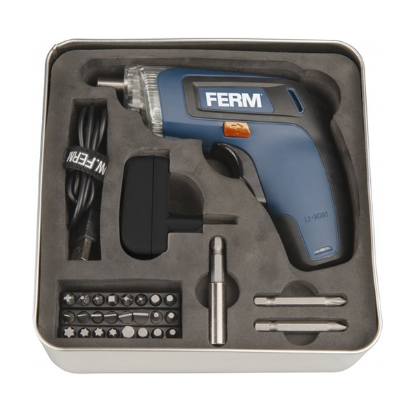 Σε σκληρή μεταλλική θήκη με 27 εξαρτήματα και φορτιστή.