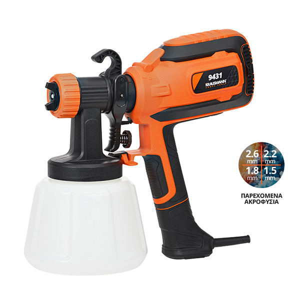 - 1 Κύπελλο ιξώδους, 1 Βελόνα καθαρισμού, 1 Βούρτσα καθαρισμού, 4 × Ακροφύσια: 1.5/1.8/2.2/2.6 mm, Μύτη προσαρμογής αέρα – στενή δέσμη, Εγχειρίδιο χρήσης
