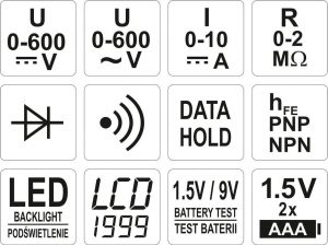 Ο γενικός μετρητής YT-73081 με χειροκίνητη εμβέλεια για κάθε μέτρηση σάς επιτρέπει να εκτελείτε βασικές και προηγμένες ηλεκτρικές μετρήσεις. Μια πρόσθετη και χρήσιμη επιλογή είναι η δοκιμή μπαταρίας 1.5V και 9V με την οποία μπορούμε να ελέγξουμε την τάση της δοκιμασμένης μπαταρίας υπό φορτίο, θα βοηθήσει στην εκτίμηση της κατάστασής της και θα αποκλείσει ή θα επιβεβαιώσει την ανάγκη αντικατάστασης.