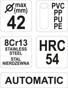 Επαγγελματικό ψαλίδι με μηχανισμό καστάνιας σχεδιασμένο για αποτελεσματική κοπή σωλήνων από πλαστικό με διάμετρο έως 42 mm. Ο μηχανισμός καστάνιας με ακρίβεια και το σωστό σχήμα της λεπίδας επιτρέπει την κοπή χωρίς σύνθλιψη των τοίχων. Το σώμα είναι κατασκευασμένο από χυτοπρεσαριστό αλουμίνιο, η λεπίδα είναι κατασκευασμένη από ανοξείδωτο ατσάλι χρώμιο με το σύμβολο 8Cr13.