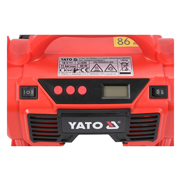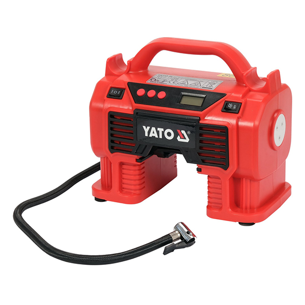 Συμπαγής συμπιεστής που τροφοδοτείται από την μπαταρία του συστήματος YATO 18 volt και την υποδοχή αναπτήρα 12 volt. Μονάδα χωρίς μπαταρία.
