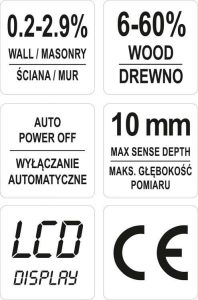 - Εύρος μέτρησης: τοιχοποιία 0,2-2,9%, ξύλο 6-60%